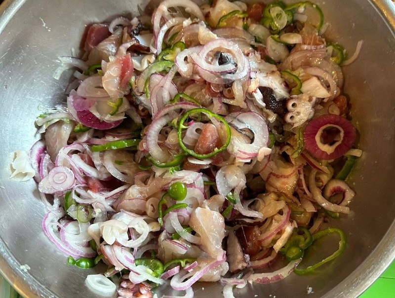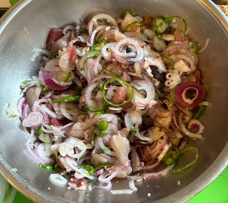 ▼恒例明神水産のかつおたたき(from中尾夫妻)、やっちゃんの得意料理のポキ、尾口村のねんぐ