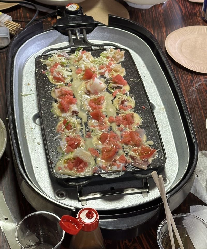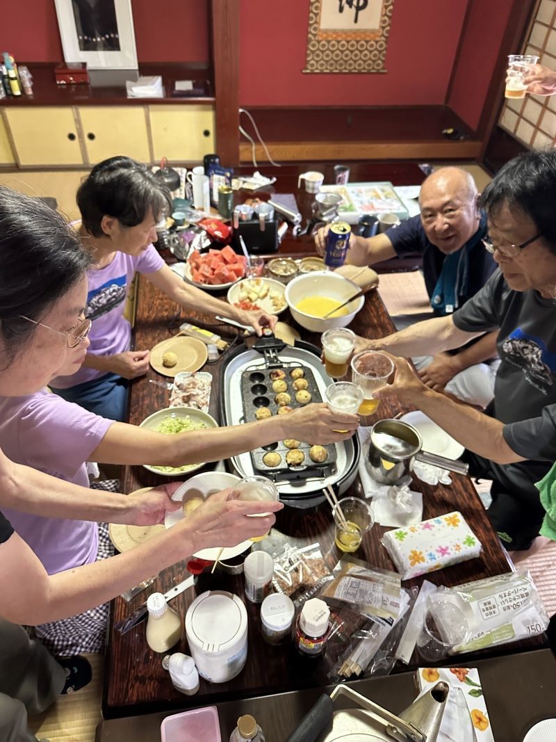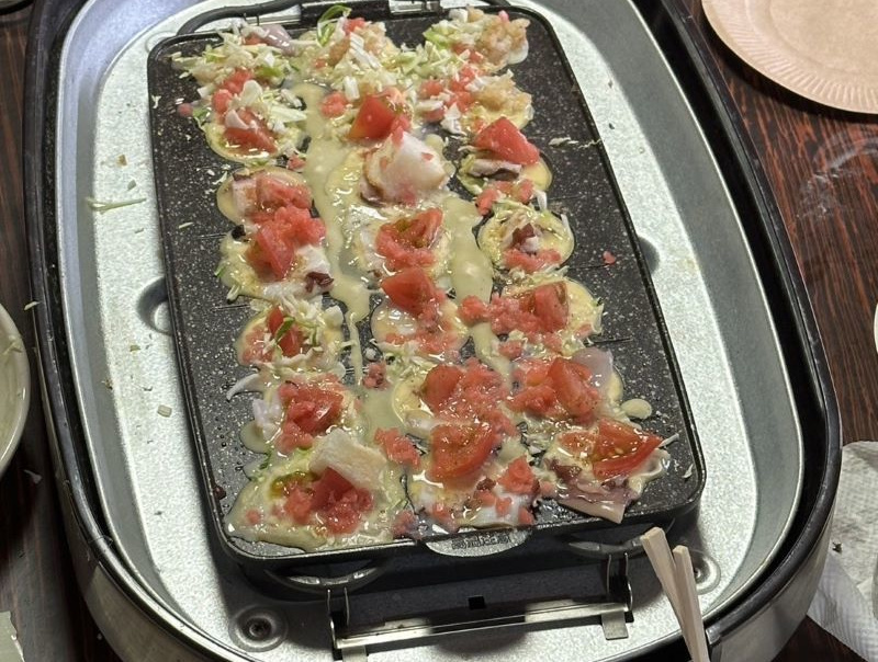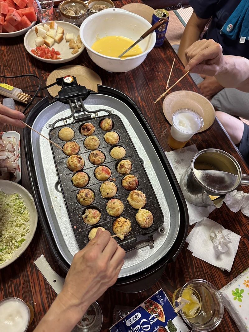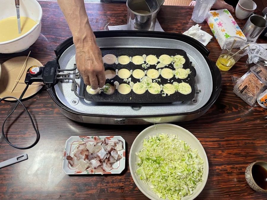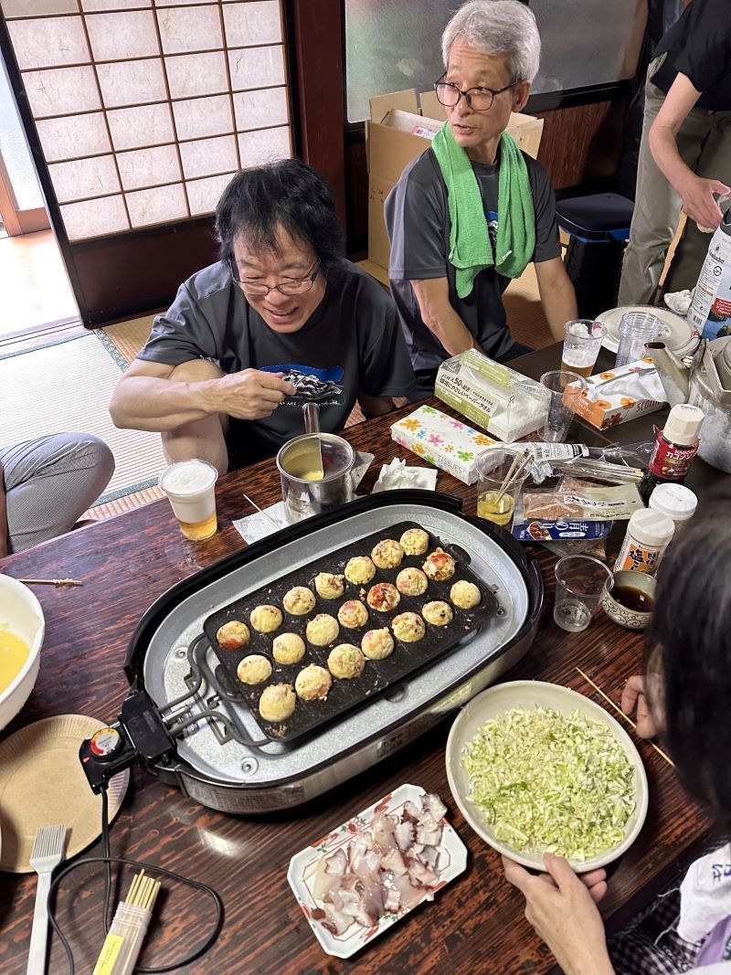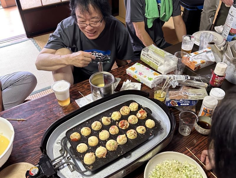 ▼二日目の昼飯はタコ焼きパーティーで盛り上がり