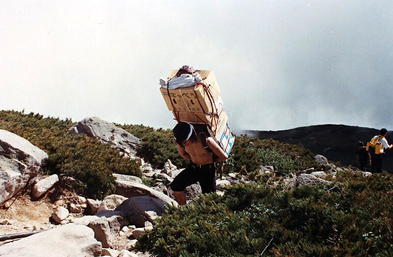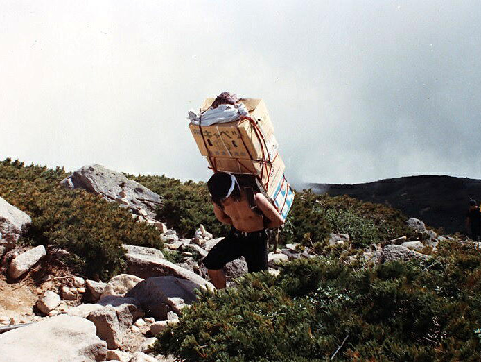 朝も早よから歩荷(負荷)稼業 わらじ脚絆が似合うだろ